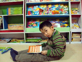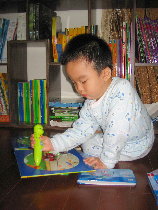 說真的,我兒子才剛滿一歲哪懂得看書啊?但是我真的覺得營造出孩子學習的環境 真的很重要,就因為力豆,下班回家後,我們不再坐在電視機前面了,我們開始輪 流陪他在書房玩"書",聽著CD,他就開始一本一本的把書拿下來,心情好就翻一 翻,心情不好翻的大力一點立體書就被撕破了,剛開始我很心疼,不過慶幸的是, 他知道他有很多書可以玩,那我就順便機會教育一下,並過濾適合他玩的書和教 具。雖然不知道他懂不懂,現在他撕破的機會少了,有幾次他竟然翻著書口裡念念 有詞(雖然我聽不懂他說什麼),不過應該是在讀書吧!