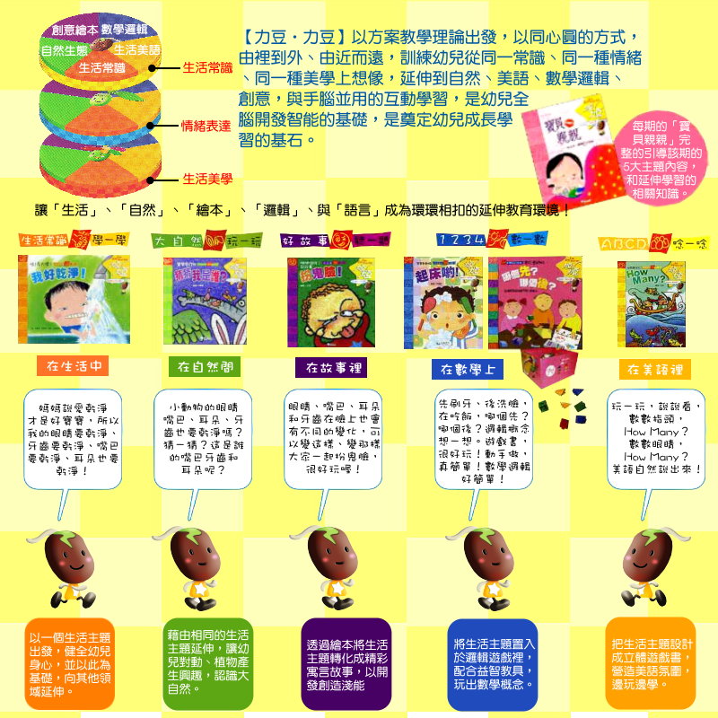 【力豆.力豆】以淺盤式的學習基礎,帶領幼兒以玩遊戲的的心情,進入充滿創意的知識領域, 大破傳統,以互動的遊戲方式,讓孩子充分享受獲得知識的樂趣,並適時開發孩子的多重淺能, 建立愉悅的學習通道。
