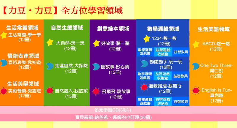 1:知識面涵蓋:生活常識、情緒表達、生活美學、自然生態、生活美語、數學邏輯、創意繪本 七大領域。 2:綜合創意表現:每一個領域均可擴及到另一個知識層面,【主題式的教育】方法,幫助孩子 觸類旁通、建構聯想與創造學習的態度。