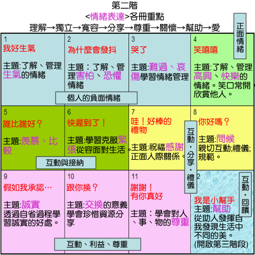 中級製作的宗旨 : 帶領孩子分辨、理解及表達各種不同的情緒,這就像是一系列幫助孩子探索心靈的課 程,希望藉由進階的學習,培養孩子正面管理情緒的能力。 幼兒通常只會使用「哭與笑」兩種極端的形式、直接展示自己的情緒 。 幼兒的恐懼,真的是來自於「黑暗」或「鬼怪」嗎? 要怎樣才能天天笑口常開呢? 如何帶領幼兒認識同儕間因為比較所產生的嫉妒情緒 如何運用各種情境,引導幼兒辨識焦慮的情緒 。 收到禮物還應該注意哪些禮儀呢? 打招呼的意義是什麼﹖ 「誠實」和「說謊」是比較複雜的心理情緒 。 為什麼孩子要向辛苦準備早餐的媽媽致敬﹖ 社群中「交換」的互動過程中,又有什麼值得注意的事情? 該如何幫助別人更是要好好學習的一門創意。 0到六歲是人格發展的關鍵期。孩子長大後自信或自卑、樂天或悲觀、主動或被動、 合群或孤獨、負同情心或無情,都與這時期的情緒發展有關。 教育一個人的心智,而沒教育道德,是為社會製造了個恐怖份子。 情緒是問題的關鍵 ! 社會和情緒技巧對終生成就的影響,要比智力更重要關鍵。 懂得用心的家庭教育, 走進小孩的內心世界 ,與心對話;心中一把快樂尺 ! |
