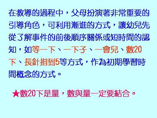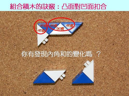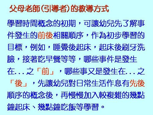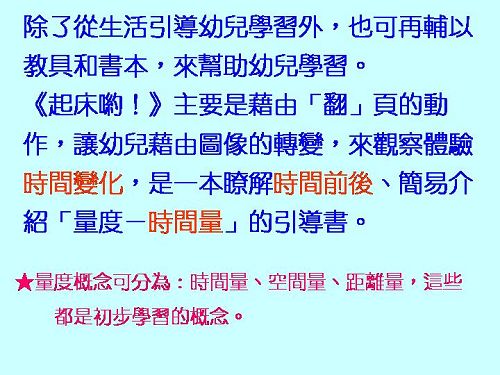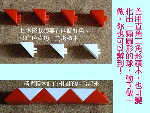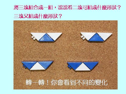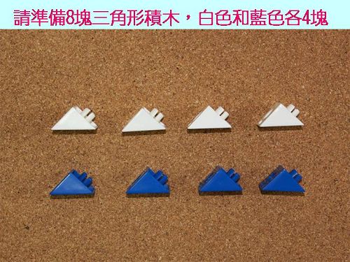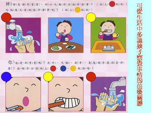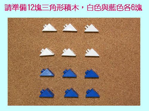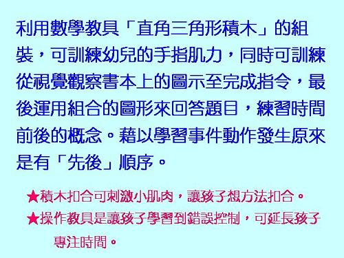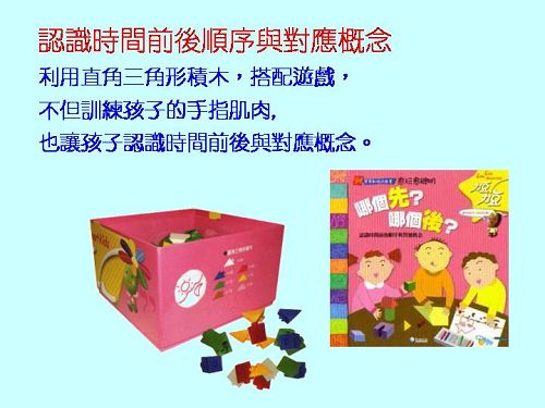 搭配書本:哪個先?哪個後? 認識時間前後順序與對應概念。 搭配教具:直角三角形積木、順序圖卡。 |
